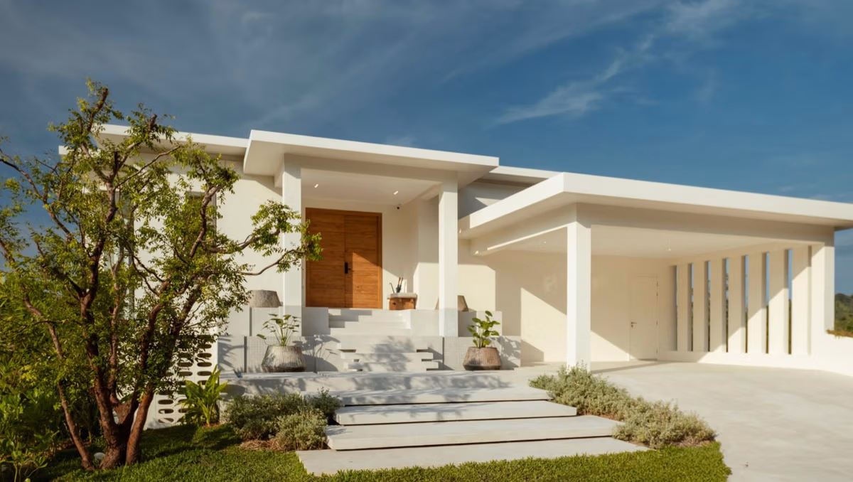 Clean architectural lines are softened by natural materials and tropical landscaping, creating a